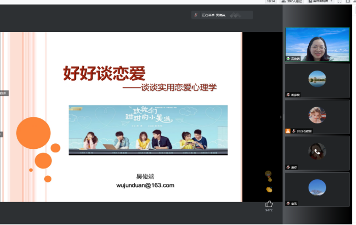 当前位置:学生工作为帮助大学生积极应对人际交往与情感困惑的问题,普及心理学知识,助力疫情期间大学生心理健康建设。2022年5月7日晚,水果派解说 通过线上线下相结合的方式开展“呵护心灵健康 护航青春成长”心理健康专题讲座。我院特邀广西卫生职业技术学院副院长、国家二级心理咨询师、医学心理学专家吴俊端教授做专题讲座。学院党委副书记唐凤、辅导员庞婷和全院本科生参加了本次讲座。