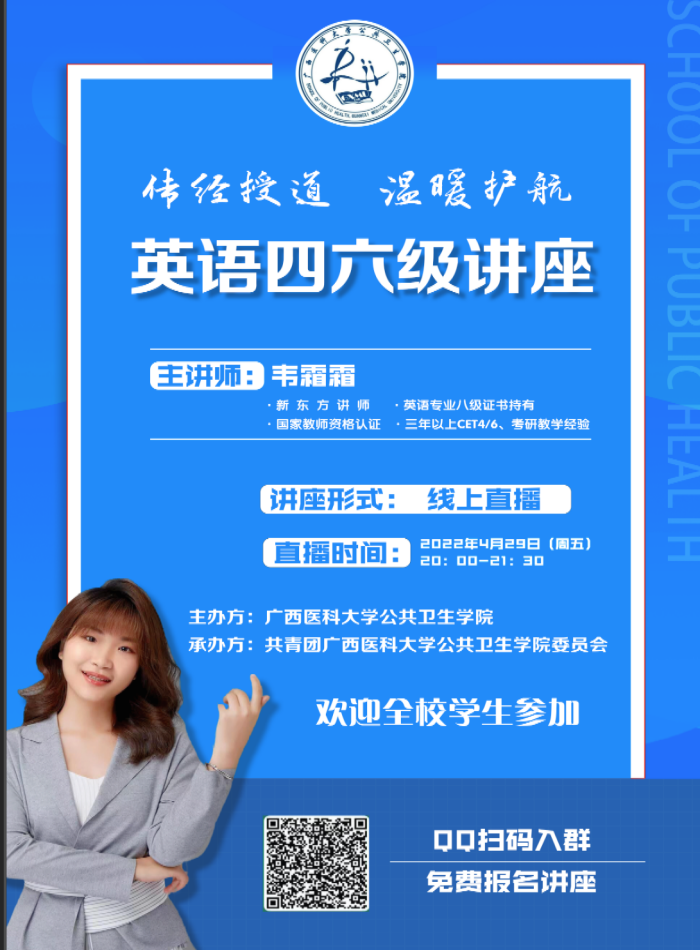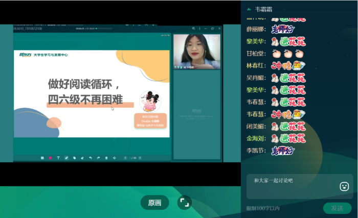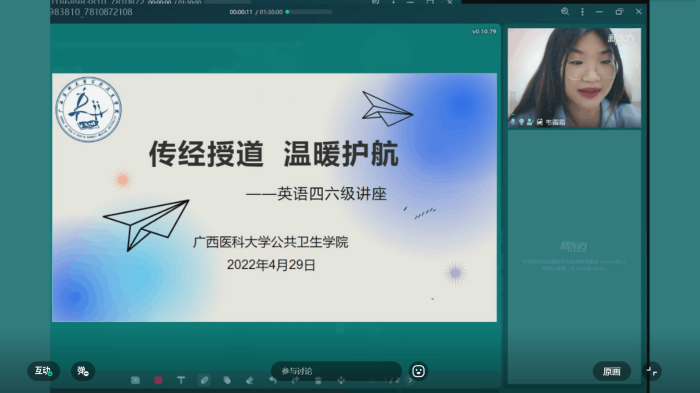 当前位置:学生工作为提升大学生英语四六级通过率,帮助报考同学更科学有效地备考。2022年4月29日晚,水果派解说 通过线上直播的方式举办 “传经授道,温暖护航”英语四六级讲座,面向全校学生。水果派解说 特邀新东方韦霜霜老师担任本次讲座的主讲人,全校接近200名学生参加了本次讲座。